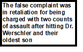 Ms. Kara Werschler ignited the investigation late in the couple's bitter divorce by filing an anonymous complaint studded with accusations of office cocaine binges, sex orgies with staff and patients, hiring prostitutes and falsification of medical drug records. Reportedly, the false complaint was also in retaliation for being charged with two counts of assault after hitting Dr. Werschler and their oldest son.